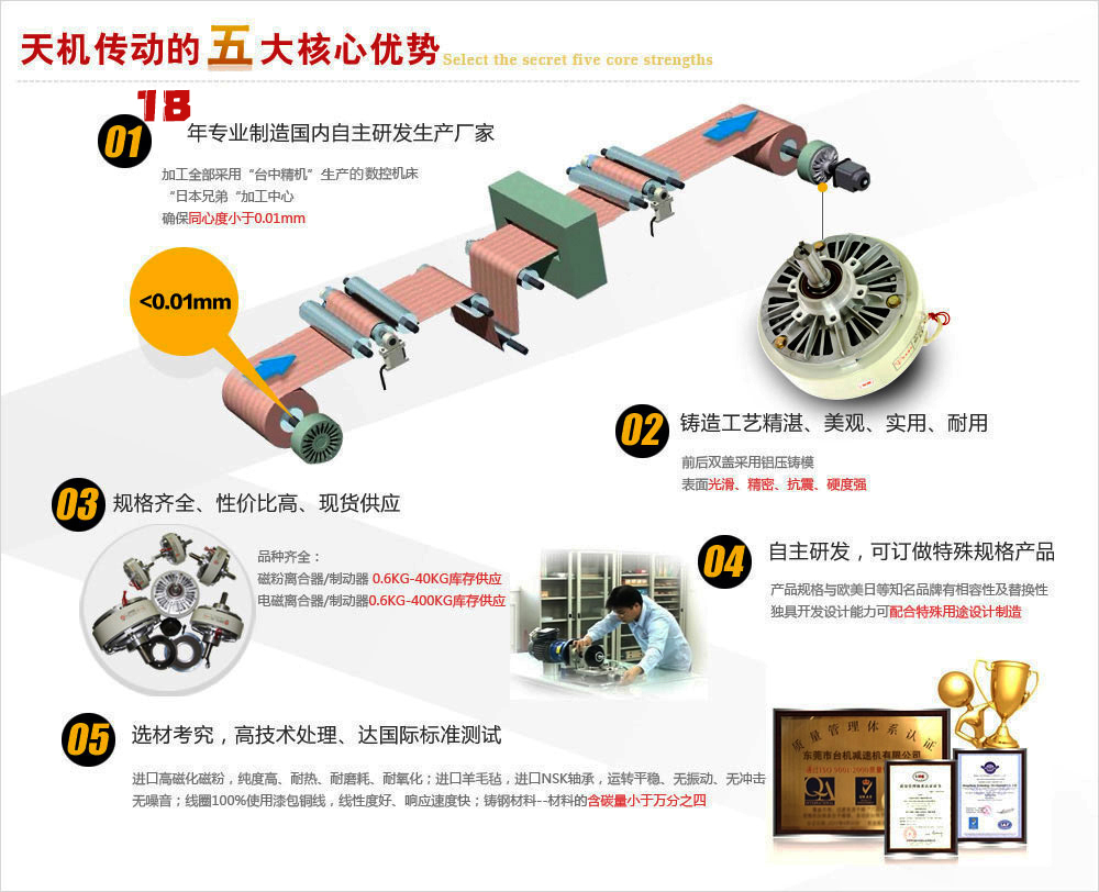 東莞市臺機減速機有限公司(天機傳動)成立于2005年,專注于研發生產銷售磁粉離合器、磁粉制動器及張力控制器等張力控制系統組件及干式電磁離合器、電磁制動器、離合剎車減速機、氣脹軸等傳動件。產品輻射全國各地,如廣州、深圳、溫州、上海、北京、蘇州、無錫、常州、南通、合肥、廈門、寧波、天津等地區。